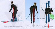 Your weight should generally be in the middle of the ski lengthways, which is over your toes not heels. Leaning forwards or backwards makes the ends of the skis drop so that you turn into the fall line, which is normally used to initiate manoeuvres.
