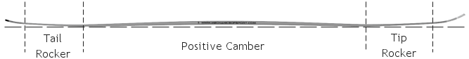 Skis with a tip and tail rocker have an area of positive camber in the middle section of the ski, but with rocker sections towards both the tip and tail of the ski. The length of each of these sections can change, making the area of positive camber longer or shorter, as well as moving the centre of positive camber more towards the middle or back of the ski. The length of the positive camber section can change, along with the length and height of the rocker sections. This means that different skis with this camber shape can be biased more towards riding forwards or in both directions when in powder, as well as biased more heavily towards only powder skiing, or retaining better control on the piste.