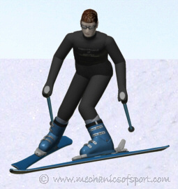 In the animation below, you can see the 3D skier making 4 turns. For the first 2 turns he is not leaning so far over the outside ski, and therefore not turning so much, or coming so far across the slope. For the second 2 turns he leans all the way over the outside ski, and turns all the way across the slope.