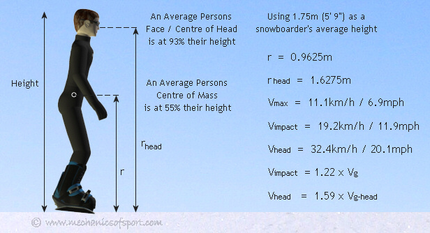 From this we find that the sideways velocity at which the edge throws you to the ground the hardest is roughly 11km/h (7mph), and that your head will hit the snow at 32km/h (20mph). This means your head will hit the snow 1.6 times harder than if you had fallen from your head height. Overall these figures show that you do not have to be going very fast to really slam, and that although you would be unlucky for these impact velocities to seriously injure you, they will hurt. If you catch an edge at this speed it will also only be about a third of a second until you to hit the snow, which when you consider the average poised reaction time is between a fifth and a quarter of a second, it means that if you're not expecting anything you can easily hit the snow before you even realise you had caught an edge.